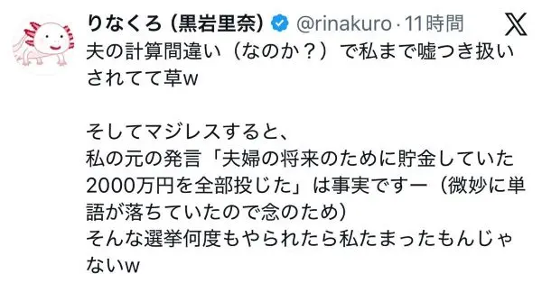 しかもその妻、さらに煽ってきた。 2000万円が将来のために貯めていたお金で、 それを使ったというのは嘘ではないよーんというわけである。 この女、舐めてんのか?