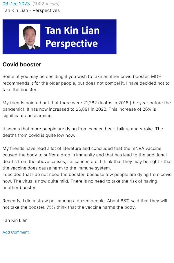シンガポール最大の保険会社であるIncomeの前CEOである Tan Kin Lianも自身の声明において、 ワクチンの毒性について認めた。
