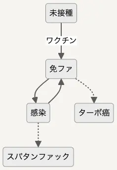 この仕組みの面白いところは、ループするところです。 つまり、感染するとそれが免ファにポジティブフィードバックされるのです。 こうして免ファ状態が続き(あるいは、特に初期の段階では悪化していき)、免ファ自体によってターボ癌になるか、 スパタンファックによって死ぬか、どちらかの運命に必ず終着するという仕組みです。 これをおれは免ファループと呼んでおり、 免ファされたワクチニストがいずれは死ぬ根拠のうちの一つです。