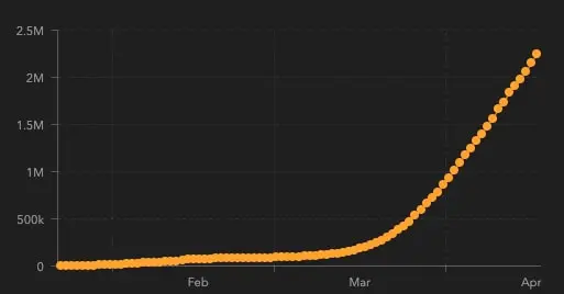 まず全世界の感染者数は現在まで、こういうグラフです。
