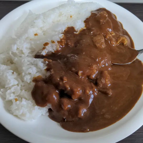 スプーンをカレーですくい、口に運ぶ。 ・・・辛くない。いや、一口目は辛くないものだ。 これから段々辛くなっていくに決まってる・・・。(Paku Paku)