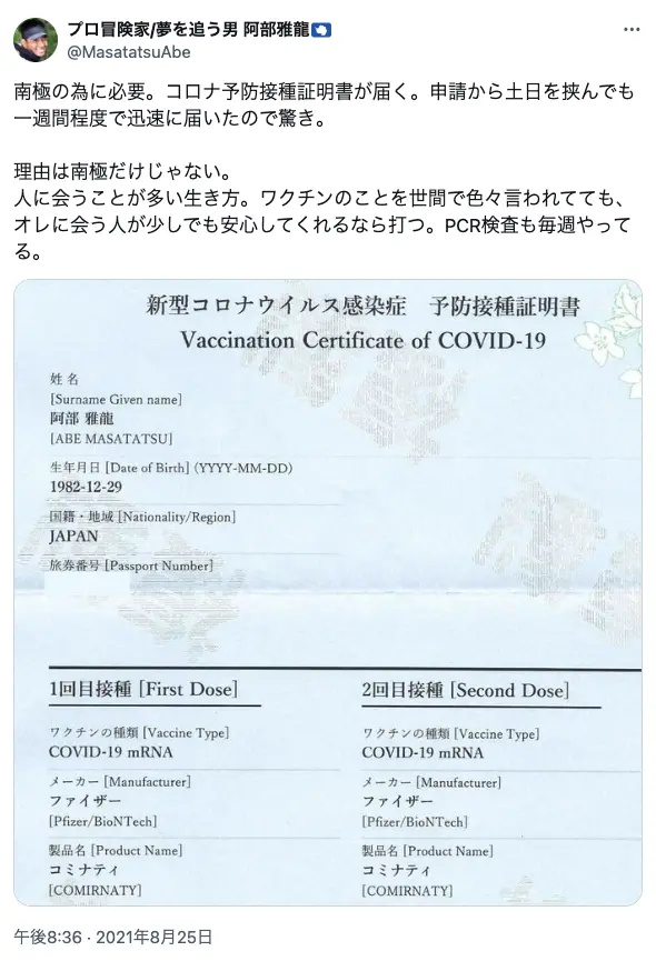阿部雅龍は、結論としては三流の冒険家だったのだ。 三流の冒険家だったから、ワクチンの毒性を見抜けず、 ほいほい打ってしまった。そして死んだ。 これは、この男の生命力が低かったということを意味する。