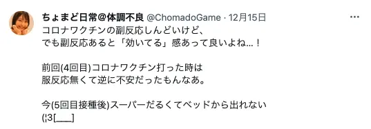 そこで、今回はおれが注目している生存中のワクチン接種者(5回)を紹介する。 ツイートを追うと、ハンドル名にもあるようにここ最近はずっと体調不良のようだ。 なぜでしょう?わかりません。