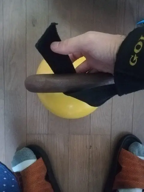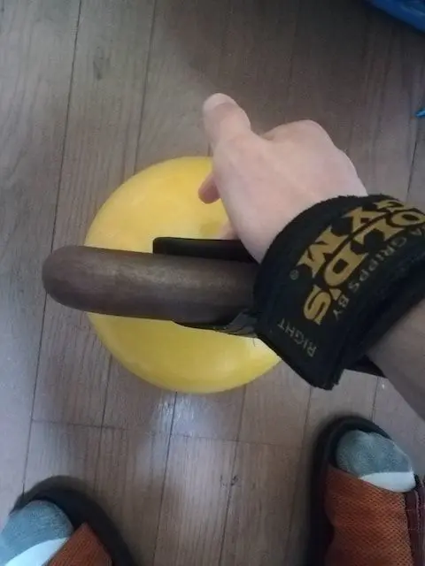 正しくは、用途が違います。リストストラップの方が向く種目もあるし、パワーグリップの方が向く種目もあります。同様に、ケトルベルをおもむろに持ち上げてみます。